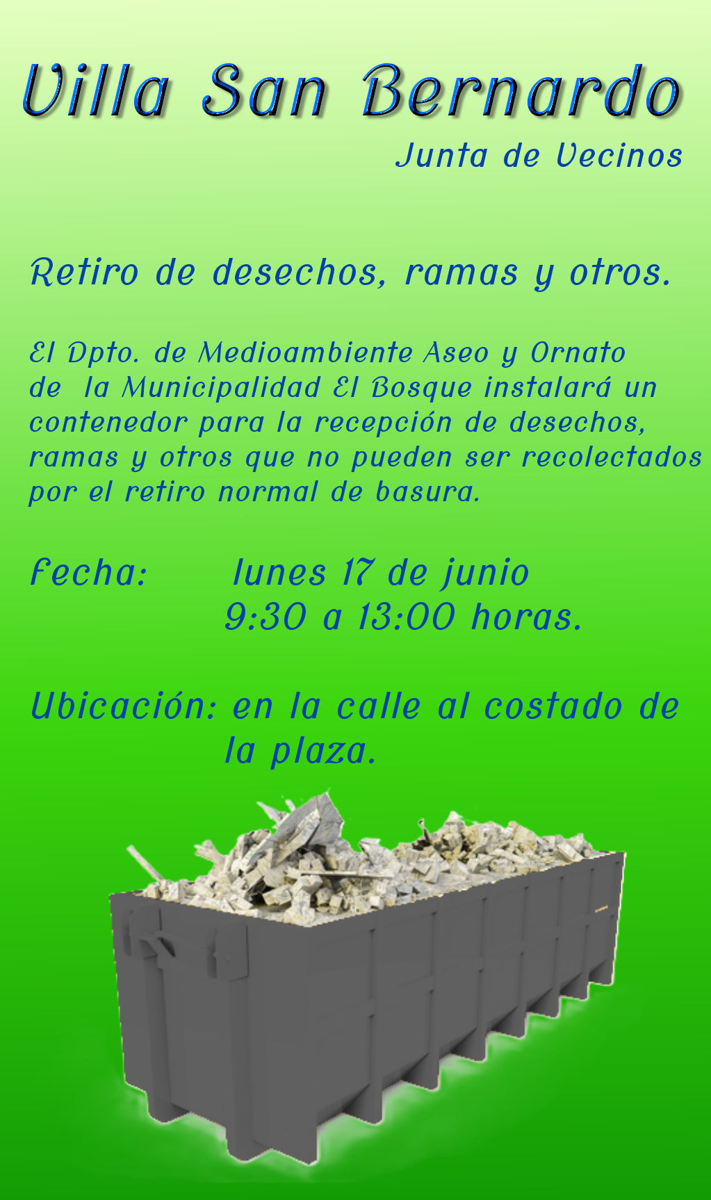 El Departamento de medioambiente, aseo y ornato de la municipalidad confirmó a la directiva de la junta de vecinos en respuesta a su solicitud que el día lunes 17 de junio desde las 09:30 a las 13:00 horas instalará un contenedor en una calle alrededor de la plaza para la recepción de desechos , ramas y otros de los cuales los vecinos deseen deshacerse.